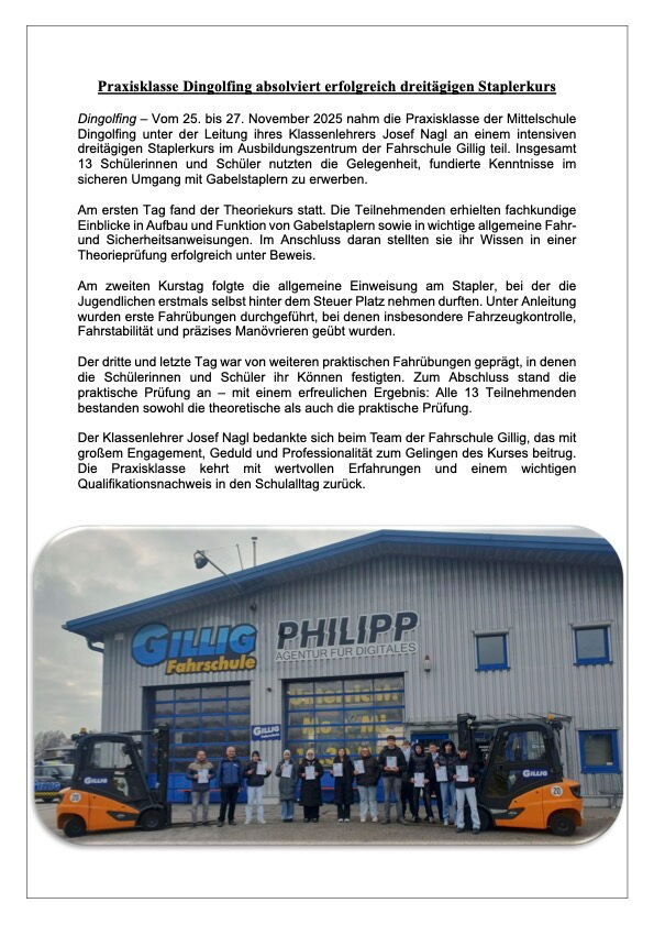 Praxisklasse absolviert erfolgreich dreitägigen Staplerkurs
